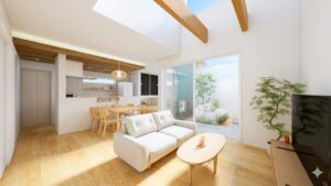 まず1階は、白色を基調としたやわらかい雰囲気のLDKで、床は無垢材(クリ)を使用しています。クリは耐久性や耐水性に優れている丈夫な木材です。また、木目が美しく出る樹種なのでさりげなく華やかさを加えることができます。