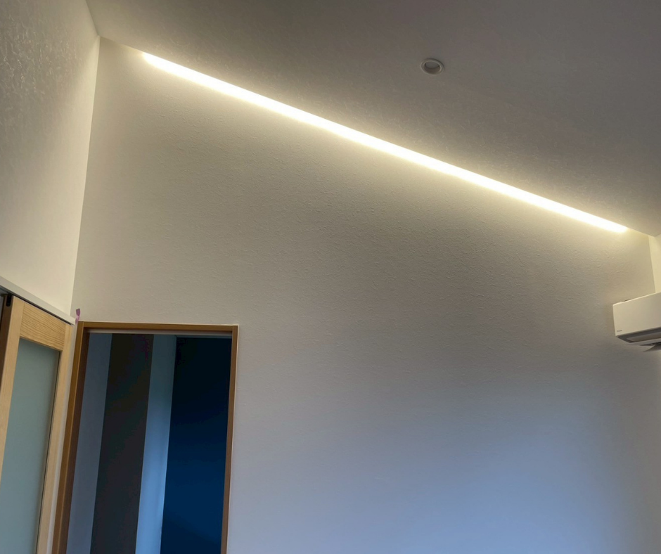 リビングに入って左手の壁がこちら!比較的、勾配の角度があり、シュッとした雰囲気です。間接照明もいい味を出しています。やわらかい雰囲気のリビングに程よいアクセントを加えます。