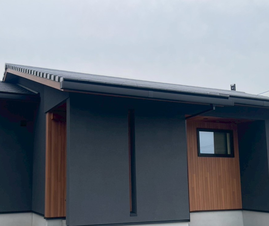 グレーを濃くすることで、深みのある色の外壁に仕上げました。木目調のサイディングで、周りの景色と馴染む外観になっています。写真を撮りそびれたのですが、玄関ドアは引き戸にすることで、省スペースと開けやすさを感じられます。玄関ドアや軒天・破風板も同じように木目にすることでより統一感が生まれています🌲