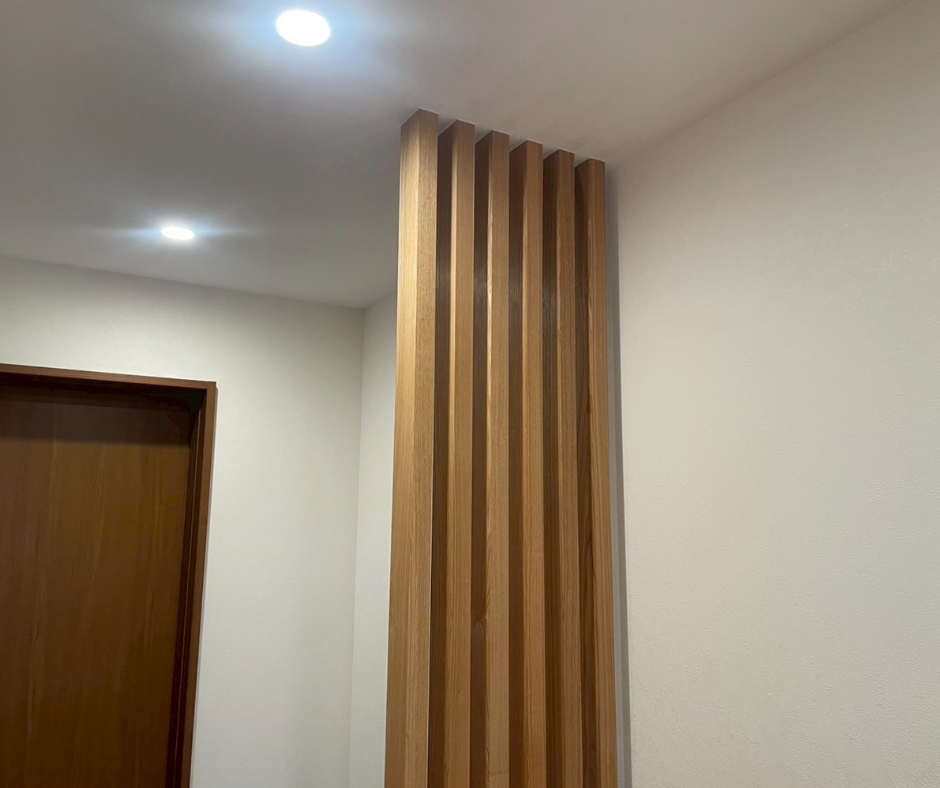 お家に入ると、造作のスリットが目に入ります。(この写真は屋内から玄関を向いて撮ったものなので、実際は左手側に見えます。)玄関と家の中をさりげなく繋いでくれる存在です。
