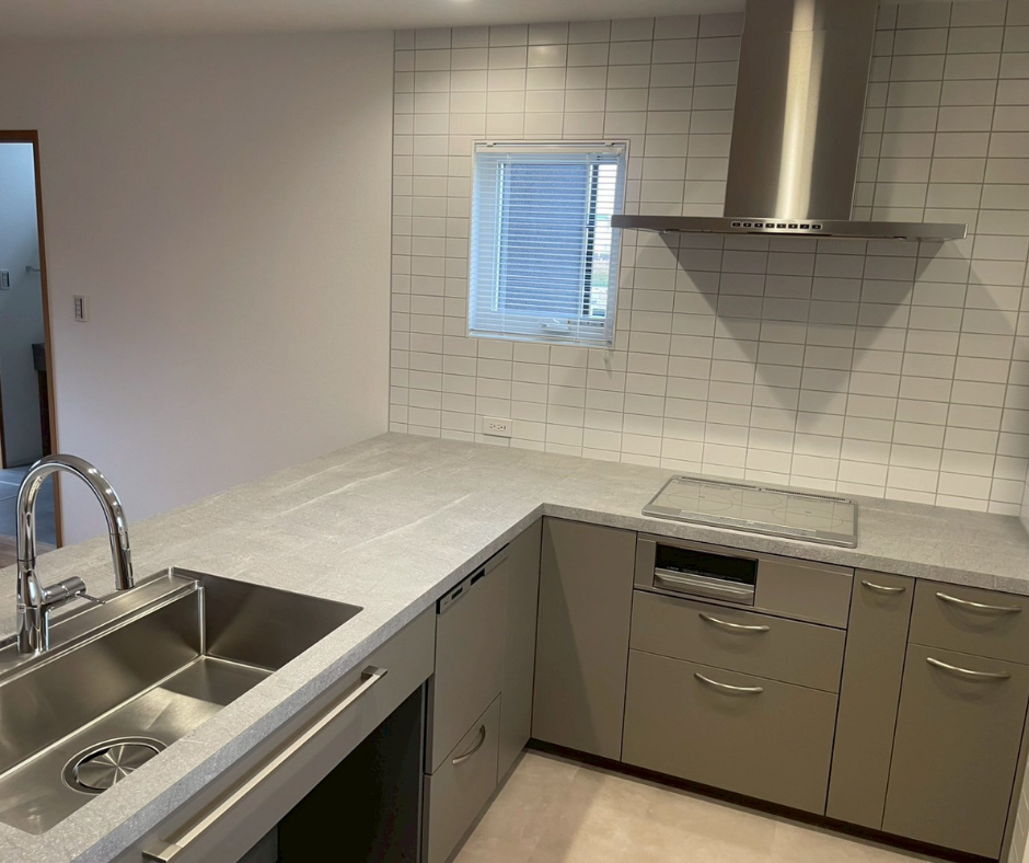 こちらは、GRAFTEKTのL型キッチンです。収納・作業・移動スペースもゆったりと設けられ、料理時間が楽しくなること間違いなしです!2人が立っても十分な広さがあります。壁にタイルを採用されているのもおしゃれですよね✨