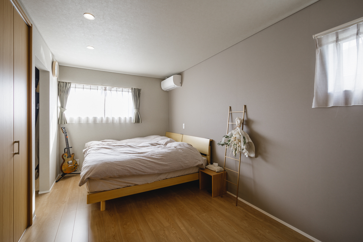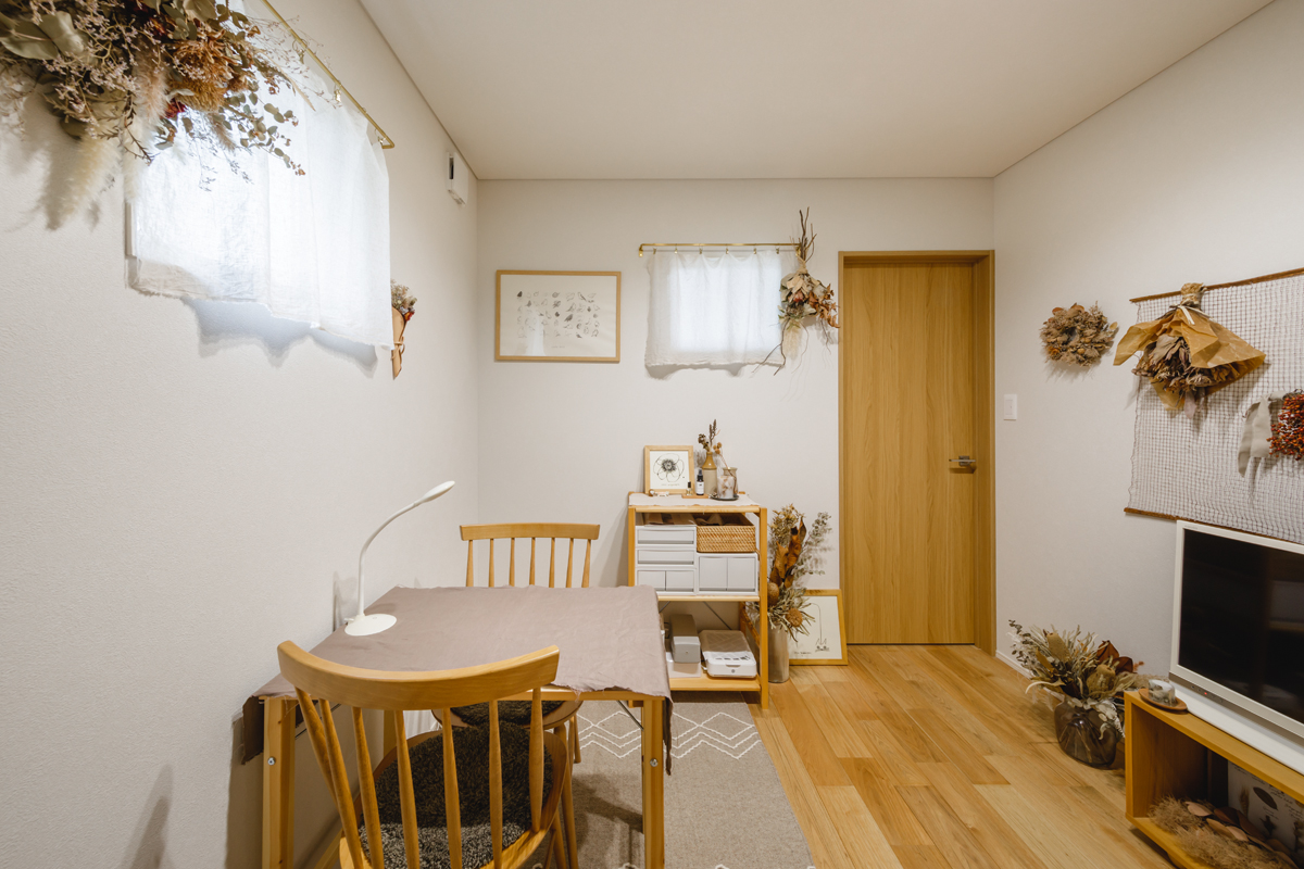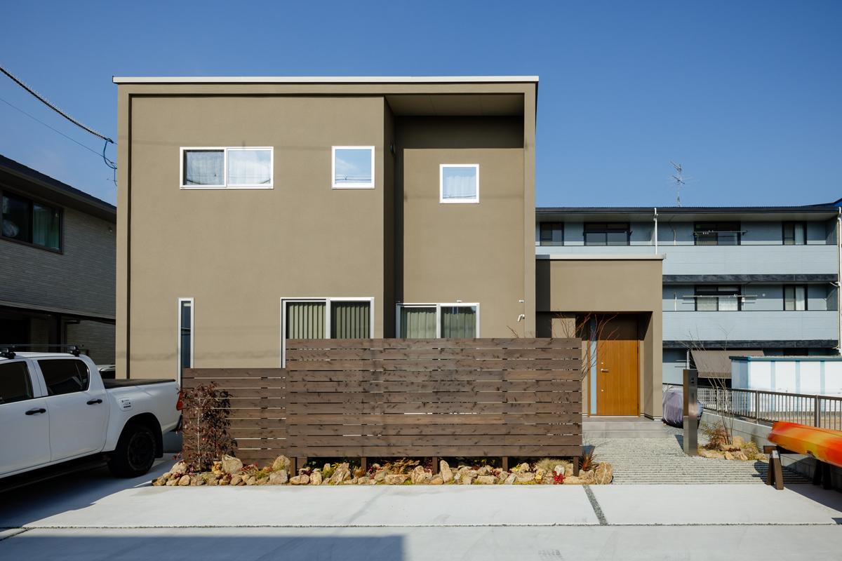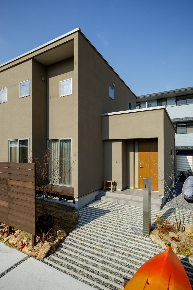 ニュアンスカラーの外壁が美しく映えるシンプルな外観で、インテリア、雑貨、ドライフラワーとの調和の取れたナチュラルな雰囲気です。