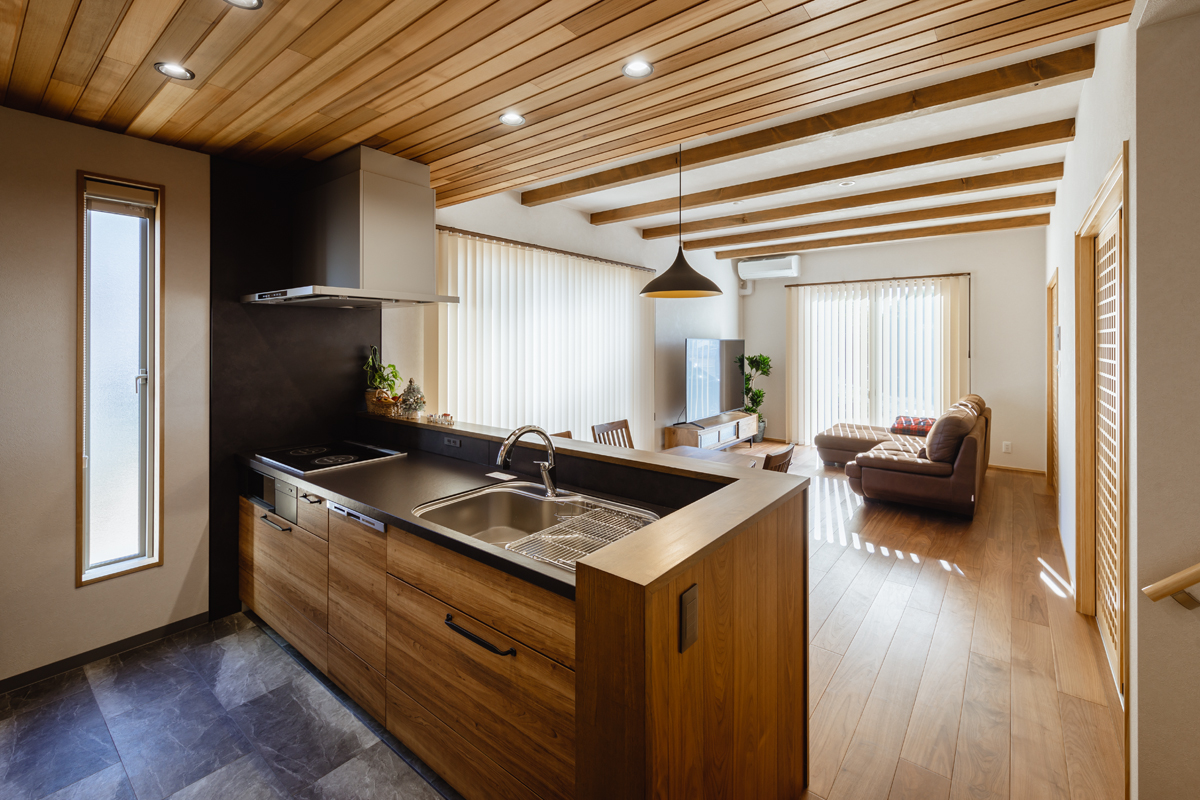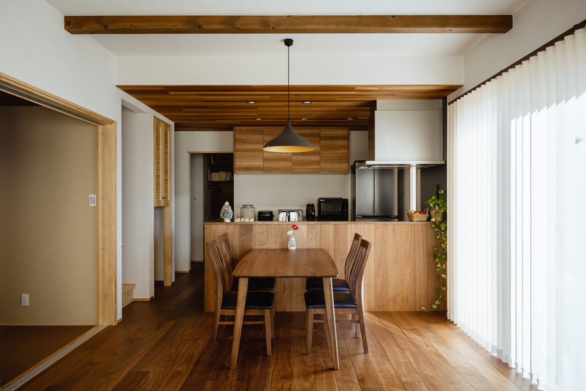 ウォールナットの床材がキッチン腰壁までつながり、一部の天井にレッドシダーを採用したことで高級感のある空間になっています。