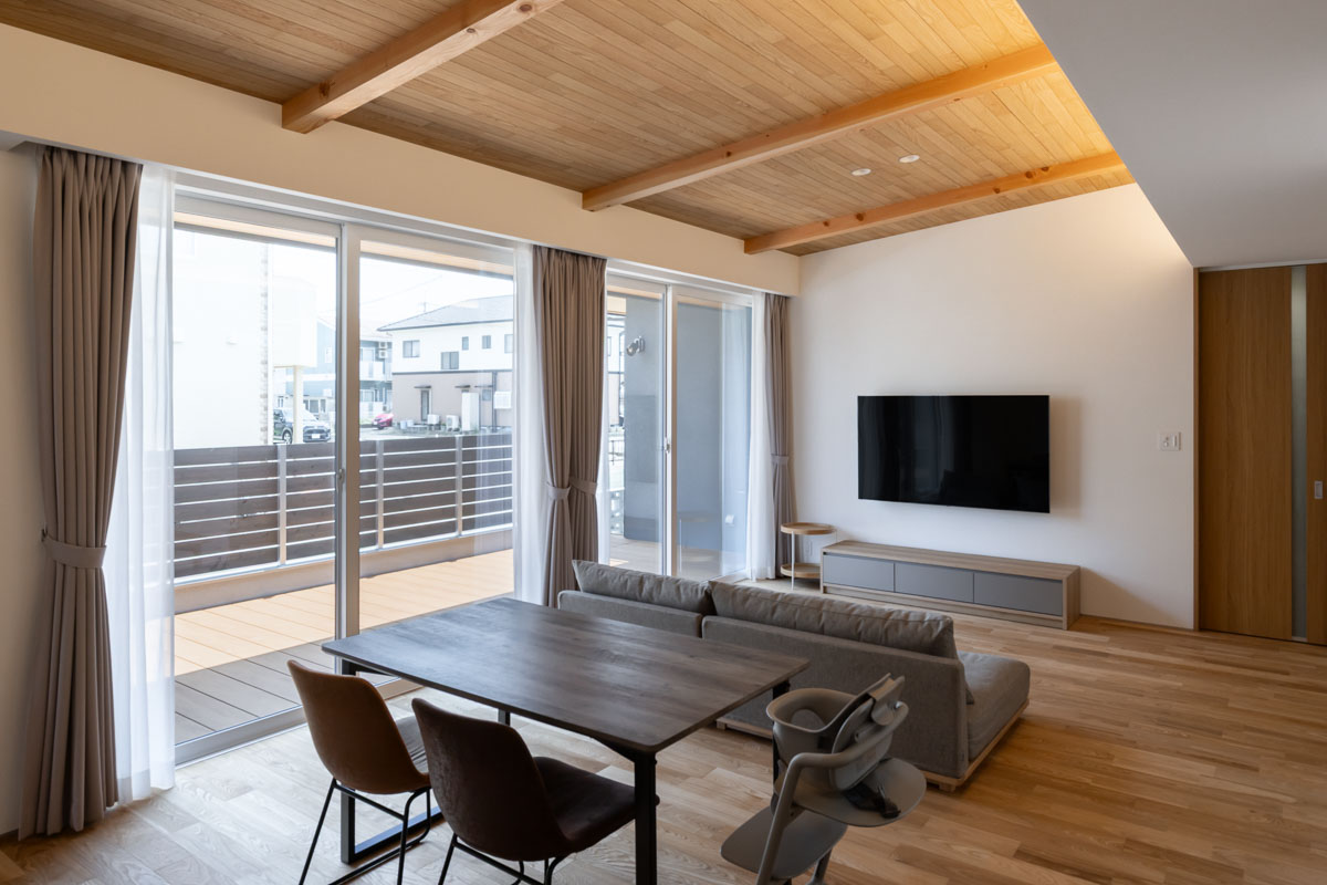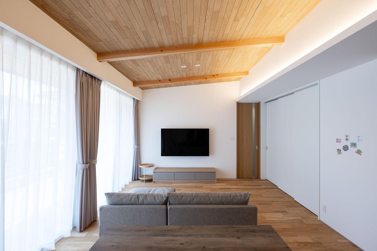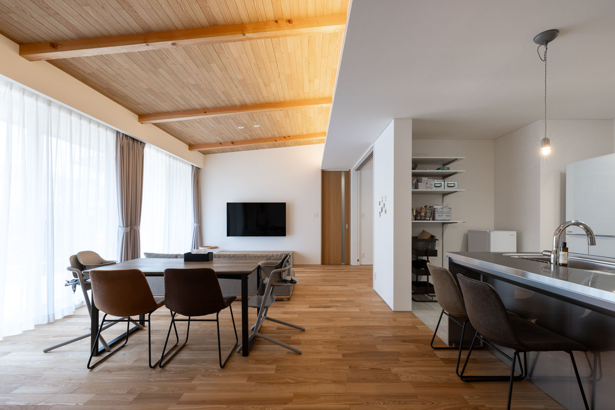 勾配天井とハイサッシで実現した開放感あるLDKは家族が集まる空間に。
