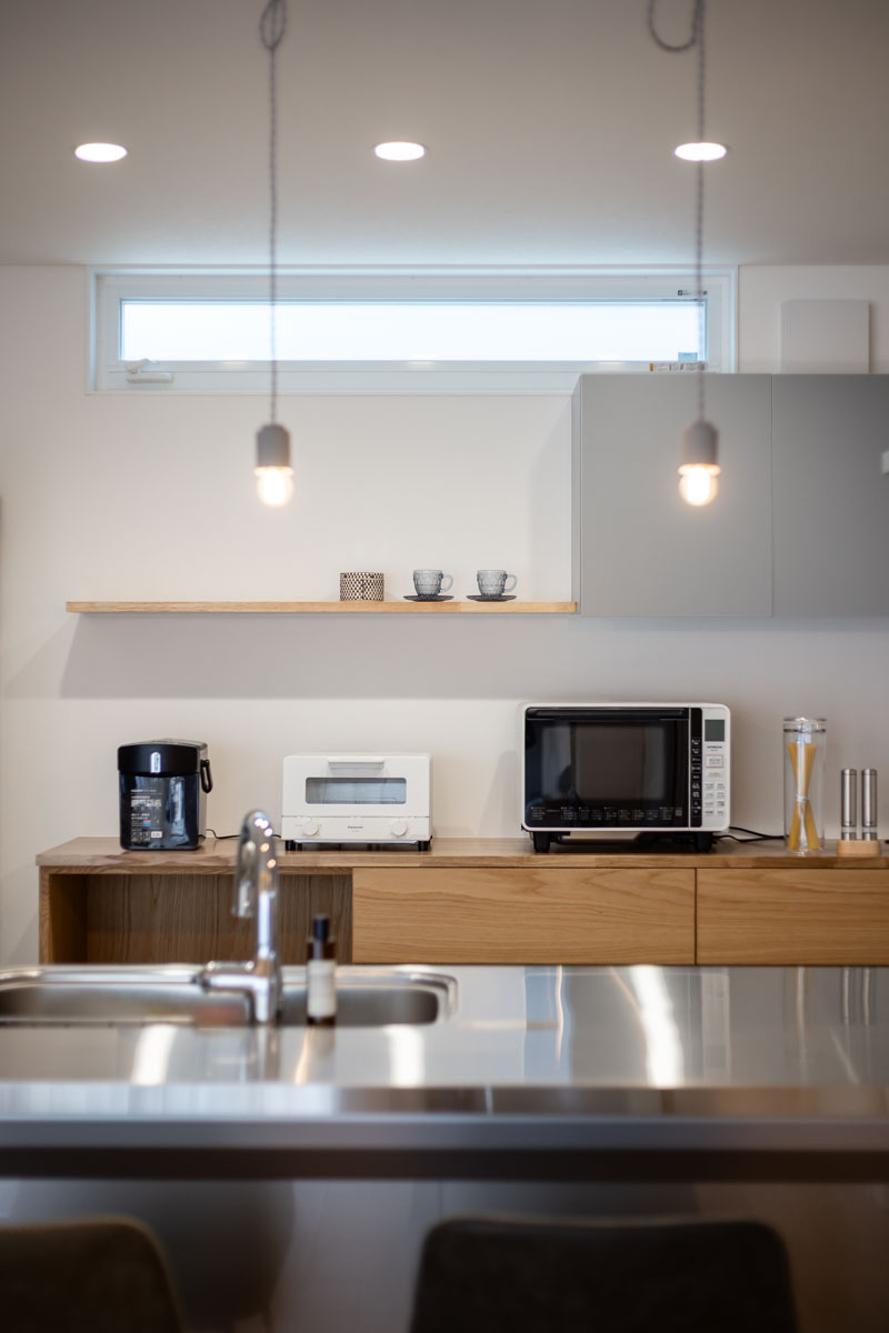 存在感のあるステンレスキッチンが空間を引き締める役割も担います。