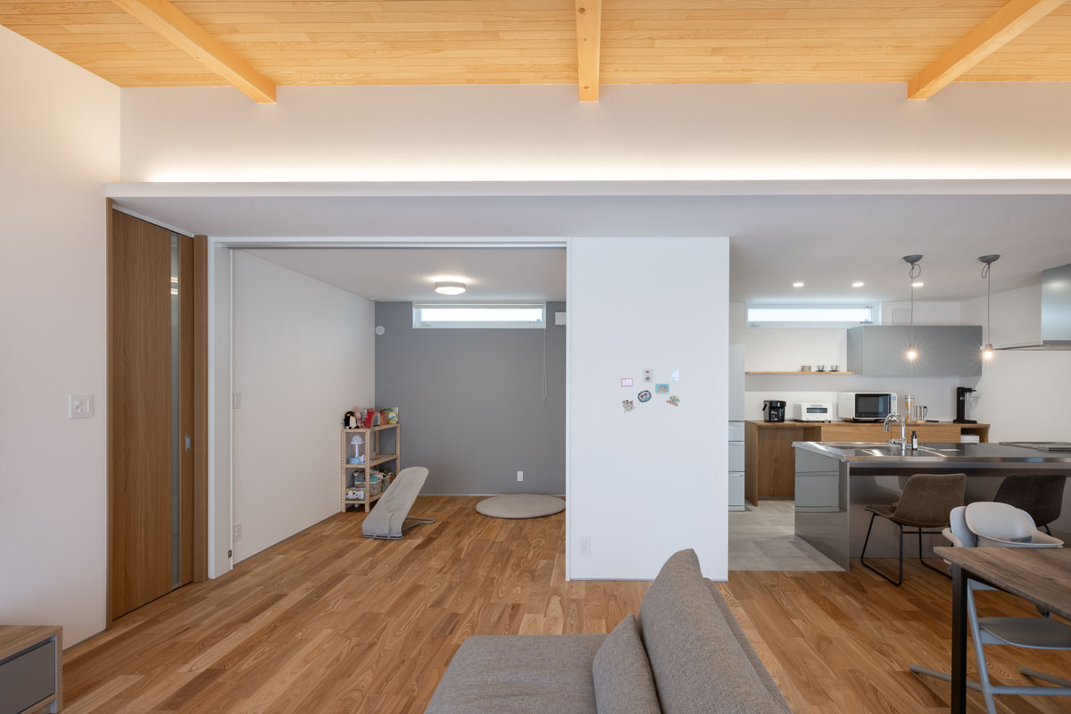開放感と木のラインが調和するLDKと中庭が緩やかにつながる平屋