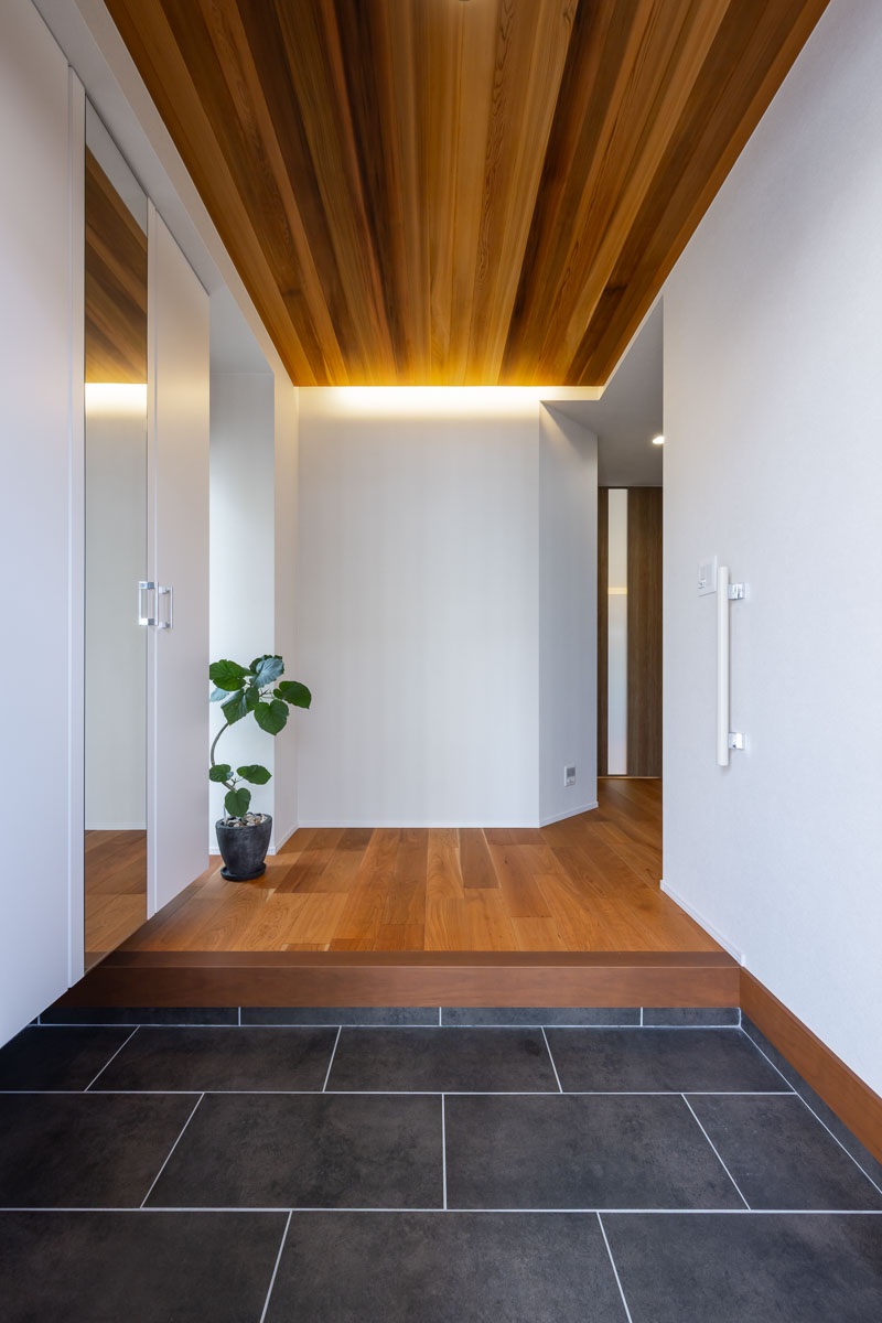 玄関ホールはブラックチェリーを縦張りにし、重厚感がありながら奥行きや開放感を感じられる空間が迎え入れてくれます。