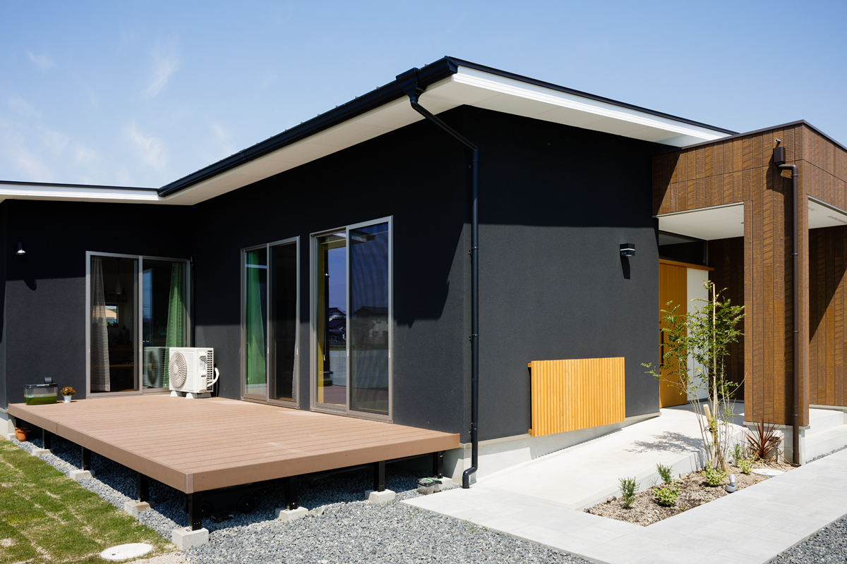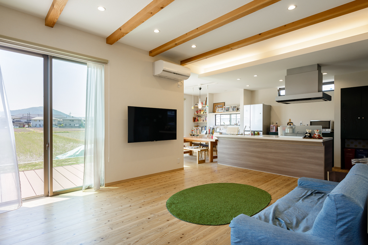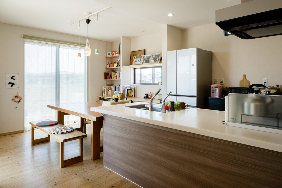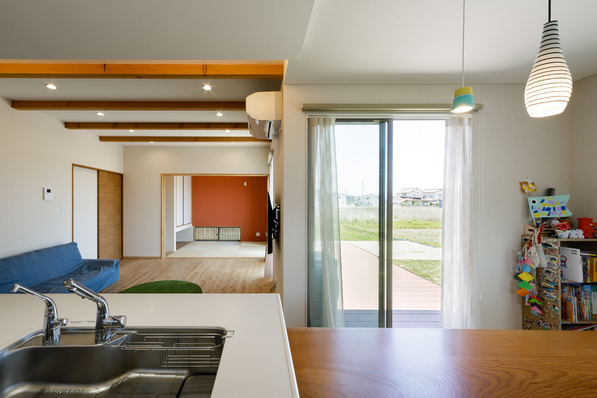 アイランドキッチンを中心に、ダイニング、リビング、デッキスペースと、三方見渡せる空間。続き間の和室の引き戸を開ければ、さらに広々とした空間となります。デッキスペースには、キッチン、脱衣室、寝室それぞれから出入りでき、動線重視で室内を回遊できる平屋となっています。