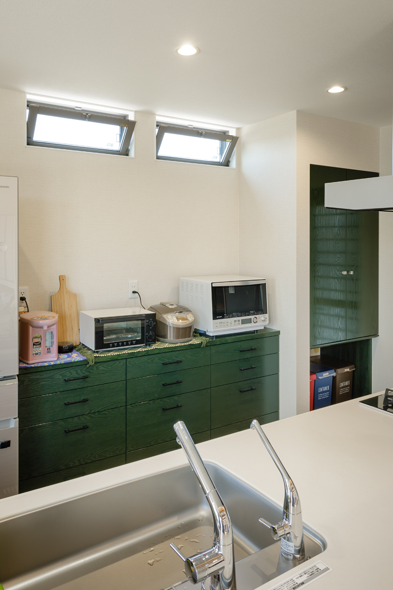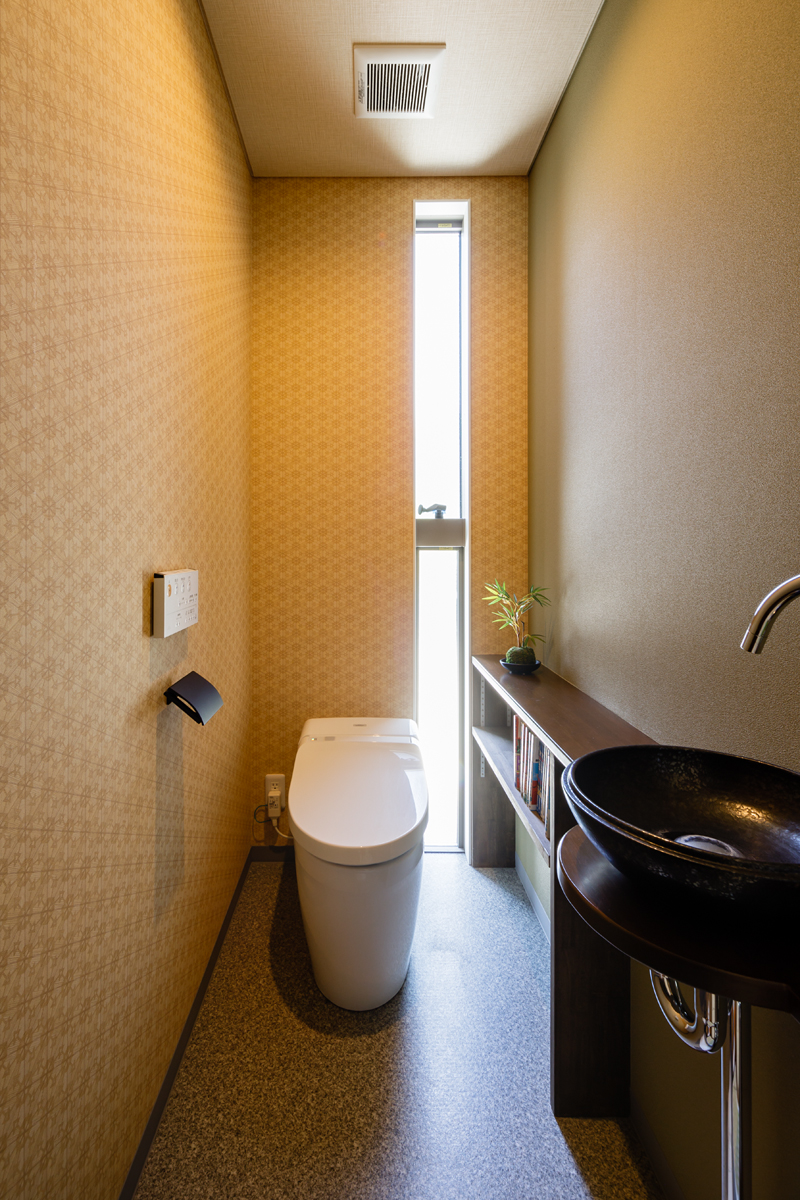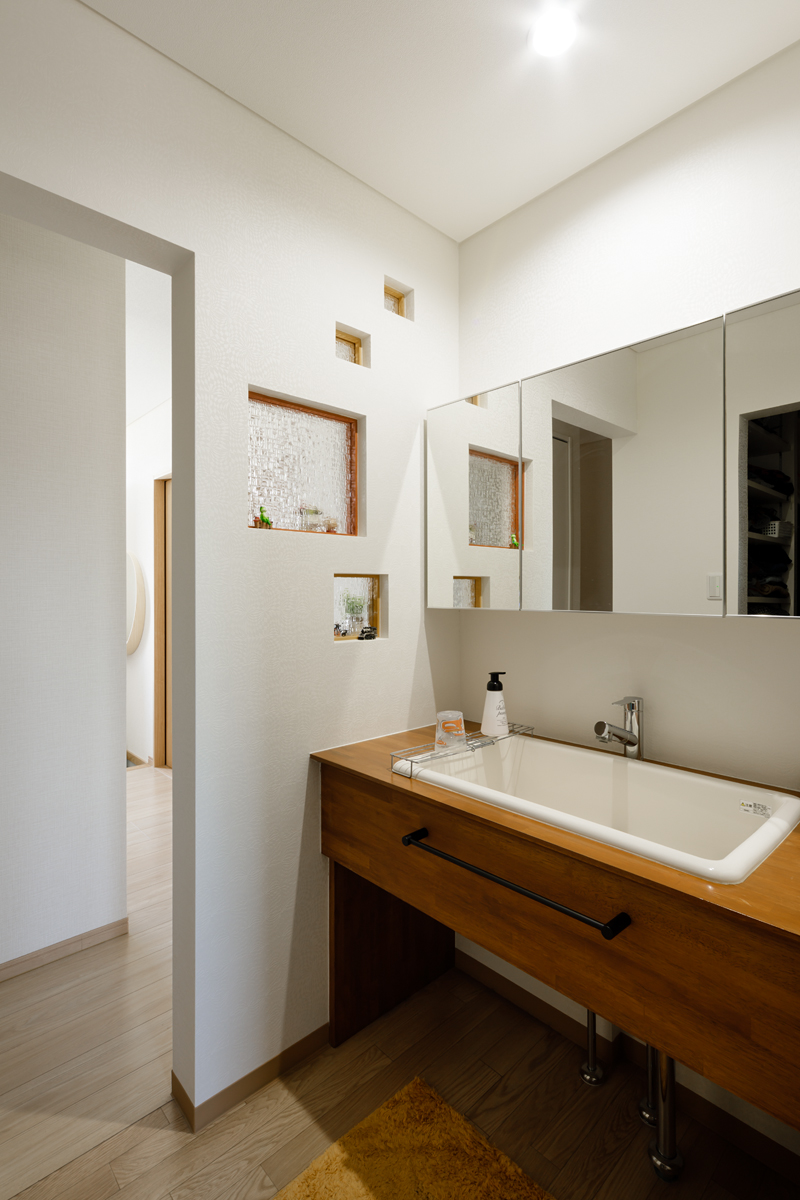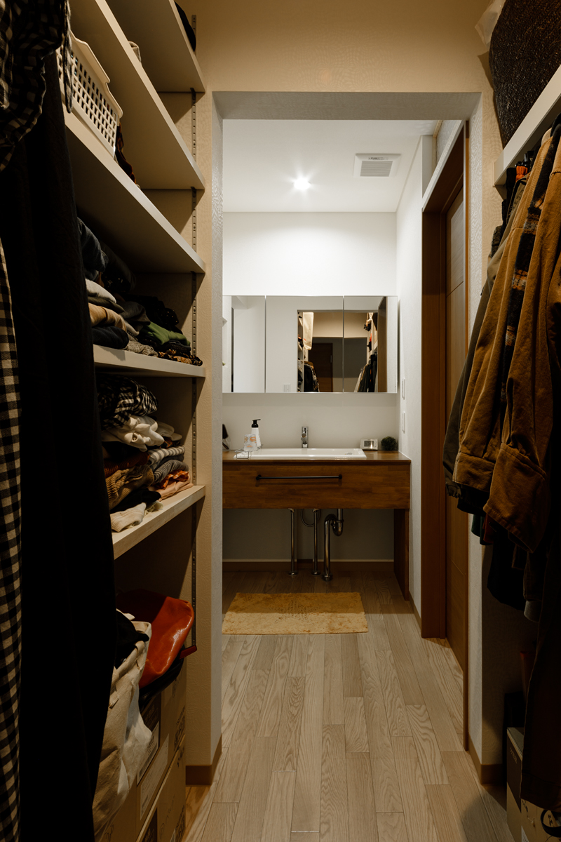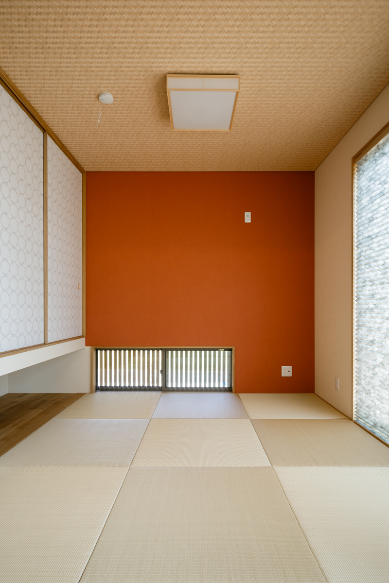 アイランドキッチンを中心に、ダイニング、リビング、デッキスペースと、三方見渡せる空間。続き間の和室の引き戸を開ければ、さらに広々とした空間となります。デッキスペースには、キッチン、脱衣室、寝室それぞれから出入りでき、動線重視で室内を回遊できる平屋となっています。