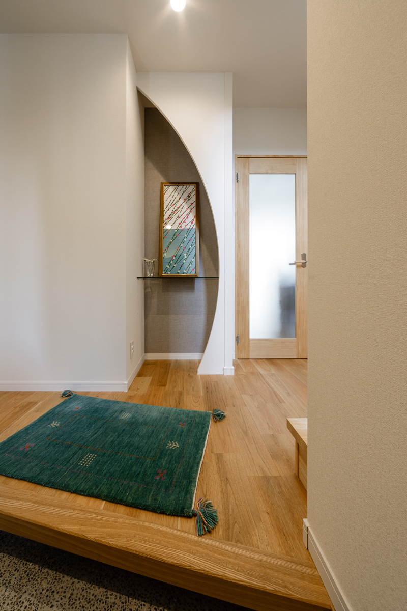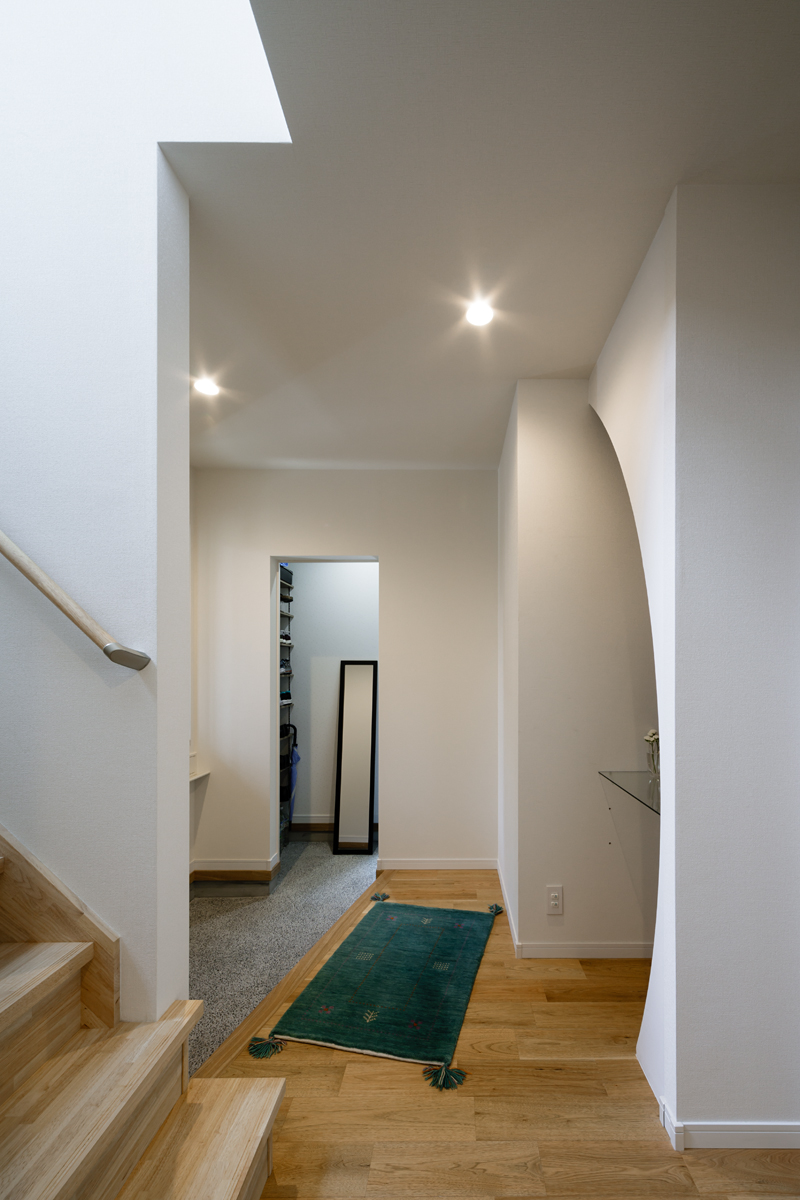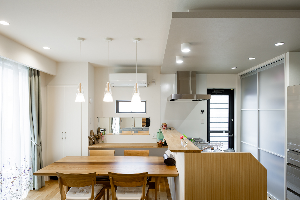 難しい立地条件の中で、駐車場と建物、リビングの日当たりや収納などについて打ち合わせを重ね、快適な暮らしやすいお家が出来ました。玄関ホールに造作した飾り棚がお客様をお迎えし、日当たりの良いLDKの壁にウッドブロックでアクセント。書斎のある間取りなどと共に、お好きなイメージの仕上がりに十分満足されておられます。