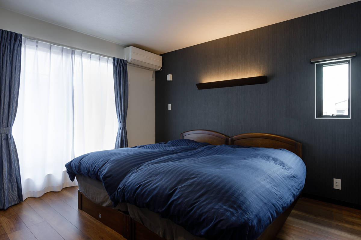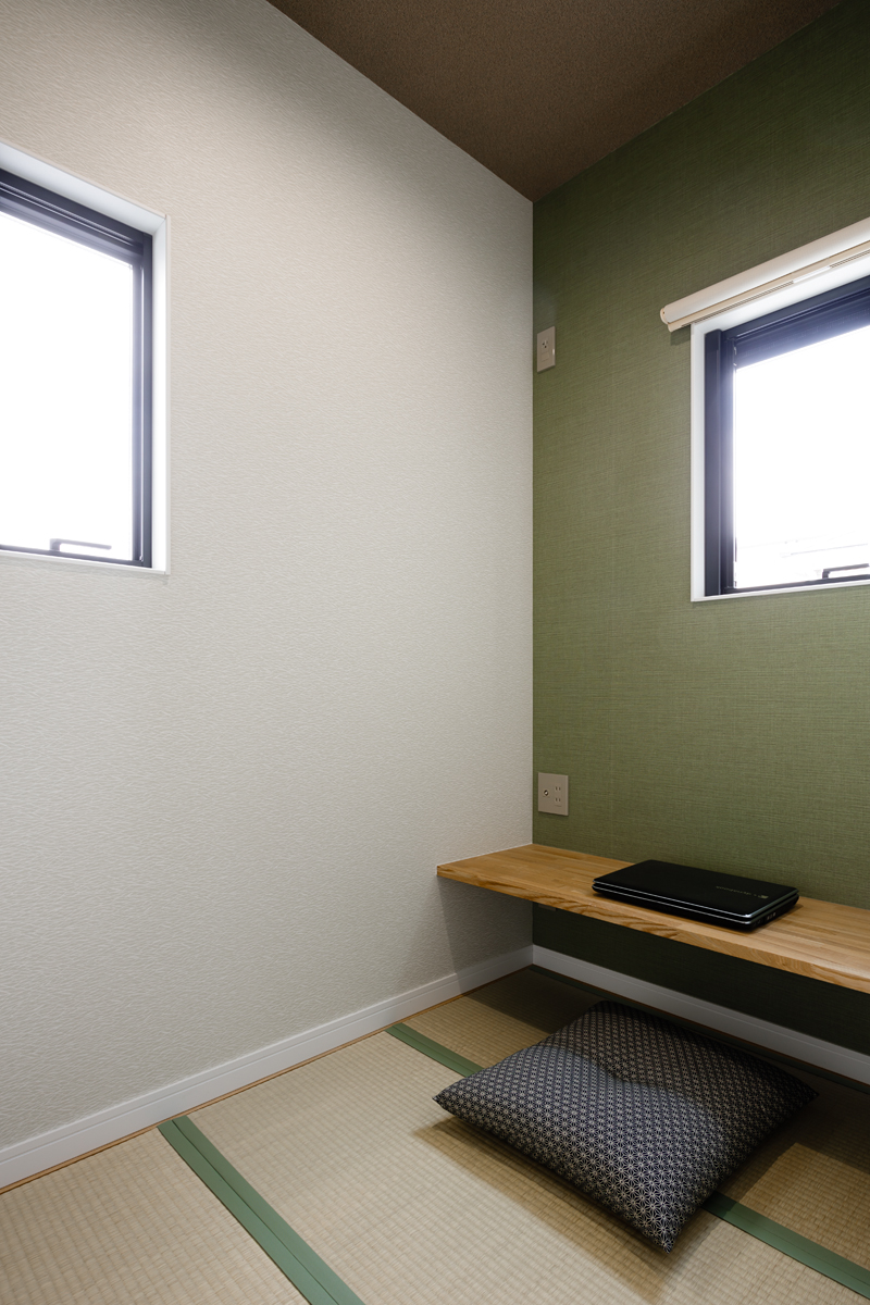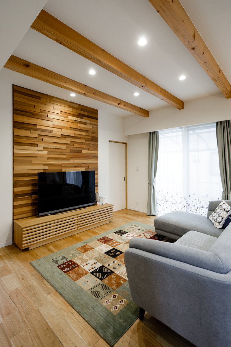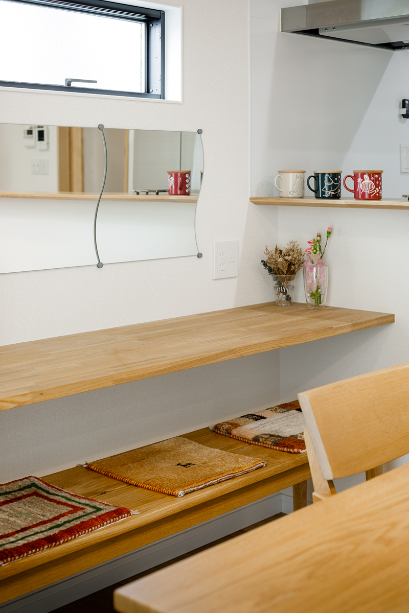 難しい立地条件の中で、駐車場と建物、リビングの日当たりや収納などについて打ち合わせを重ね、快適な暮らしやすいお家が出来ました。玄関ホールに造作した飾り棚がお客様をお迎えし、日当たりの良いLDKの壁にウッドブロックでアクセント。書斎のある間取りなどと共に、お好きなイメージの仕上がりに十分満足されておられます。