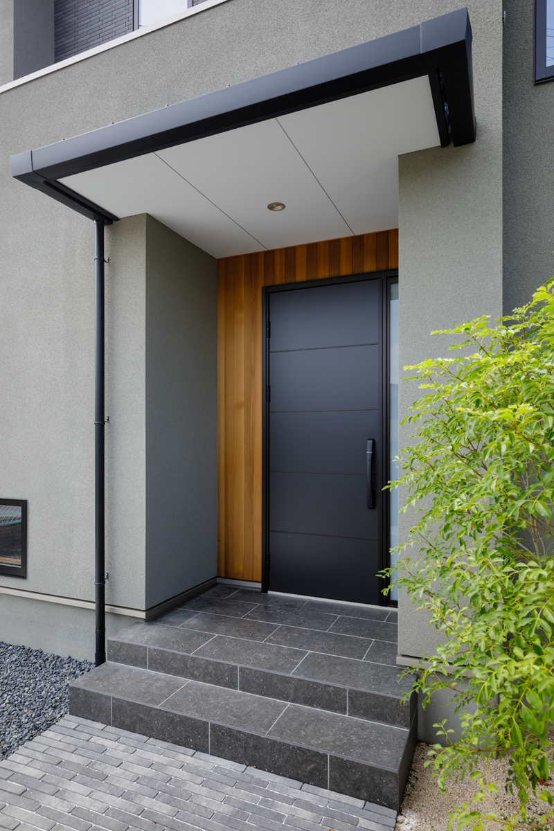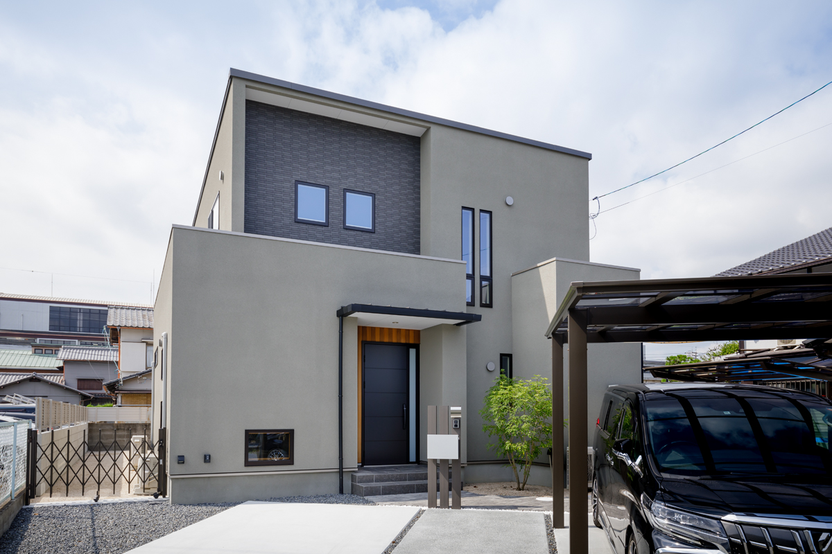 グレーの塗り壁に一部ブラックタイル張りにした外観はご主人のご希望でクールな仕上がりになりました。