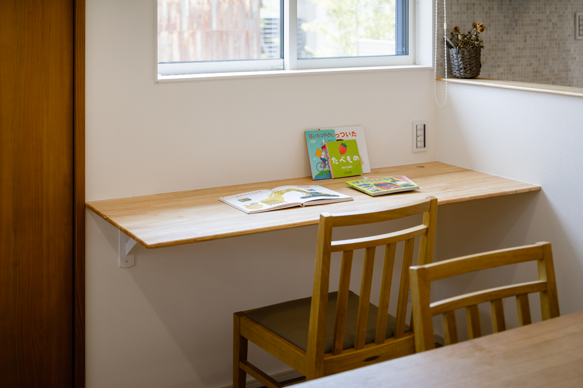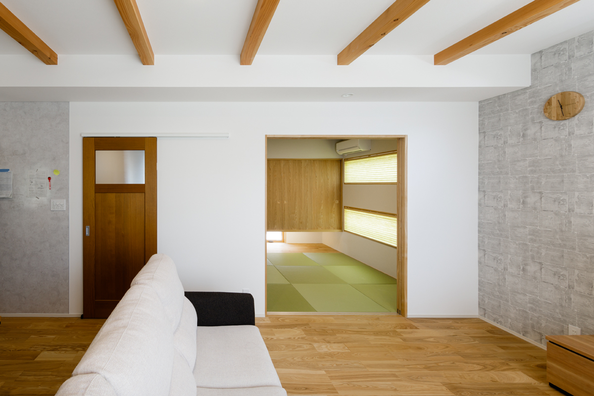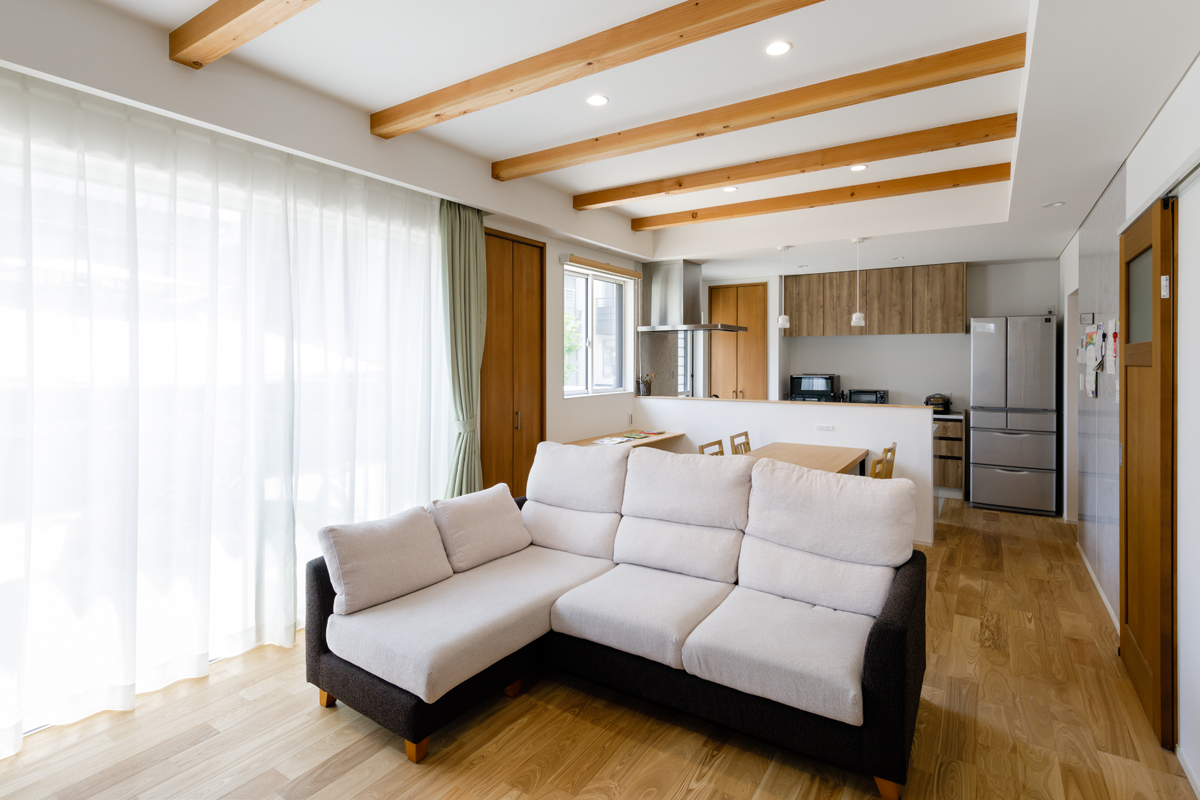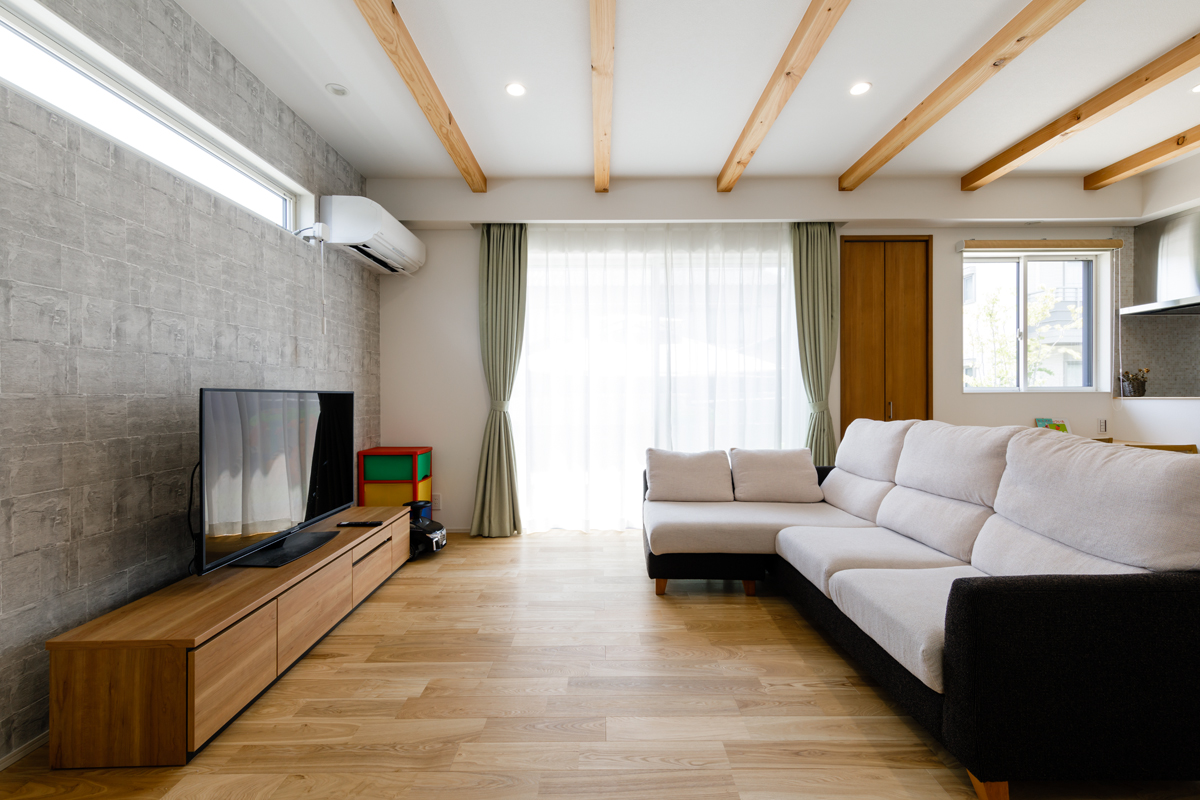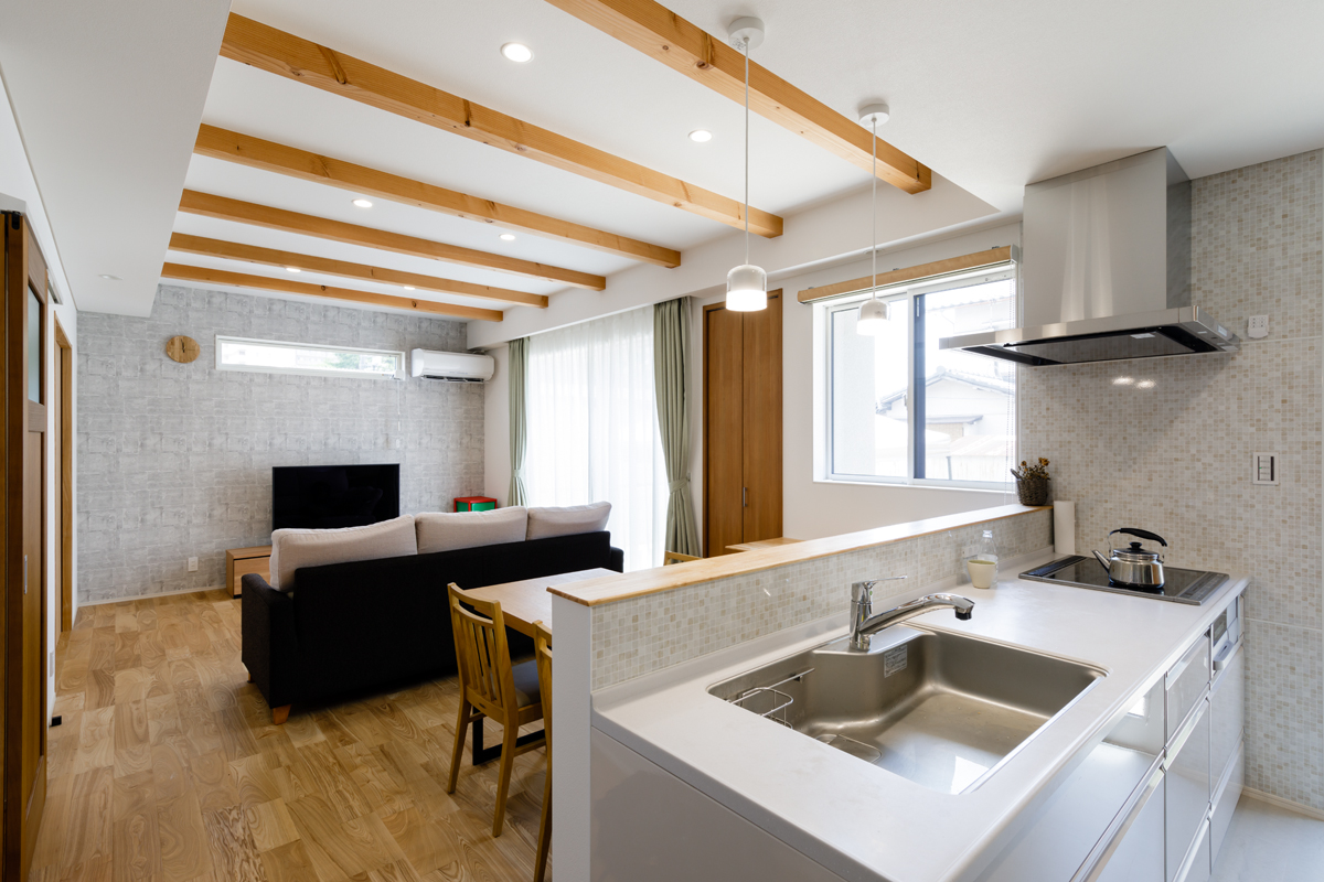 無垢の床材、梁見せがナチュラルな雰囲気を演出し、温もりを感じる空間で奥様の想いをしっかりと再現できています。 玄関収納をはじめリビング、キッチン、和室などにたっぷりと収納スペースを設置していますので、子育て中の収納の悩みも解決できます。リビングにはワークカウンター、和室には吊押入れ、アクセントクロスなども取り入れ、より快適で機能的な空間になっているのもポイントです。