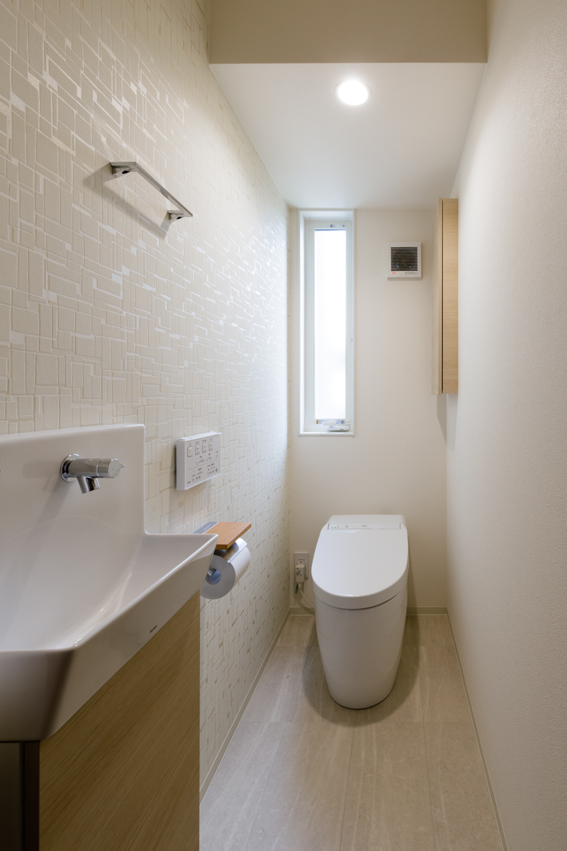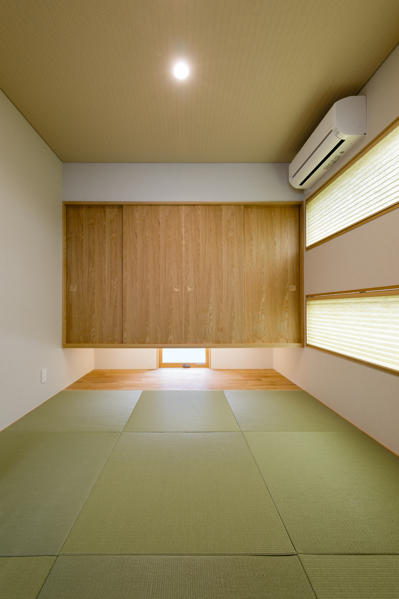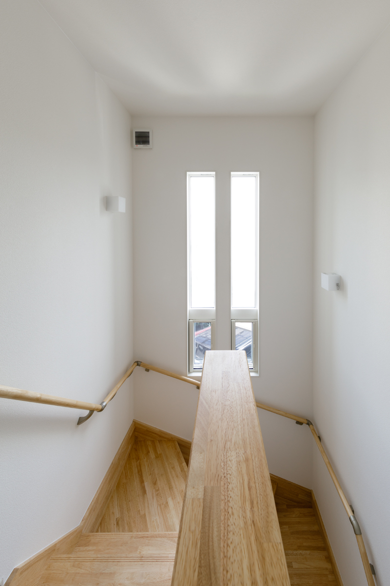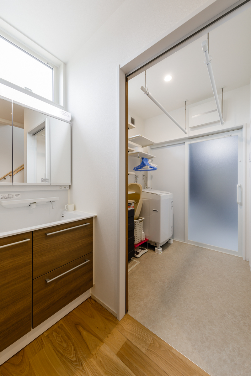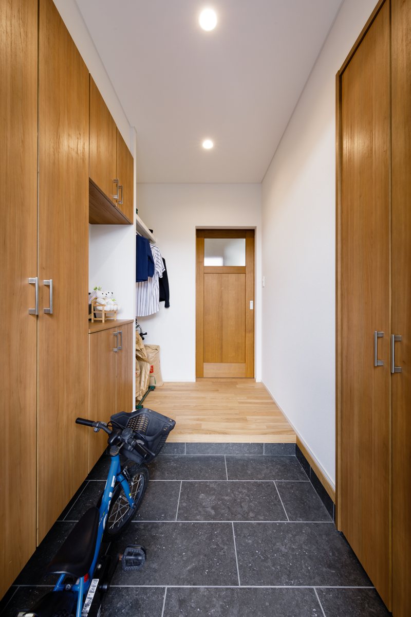 無垢の床材、梁見せがナチュラルな雰囲気を演出し、温もりを感じる空間で奥様の想いをしっかりと再現できています。 玄関収納をはじめリビング、キッチン、和室などにたっぷりと収納スペースを設置していますので、子育て中の収納の悩みも解決できます。リビングにはワークカウンター、和室には吊押入れ、アクセントクロスなども取り入れ、より快適で機能的な空間になっているのもポイントです。