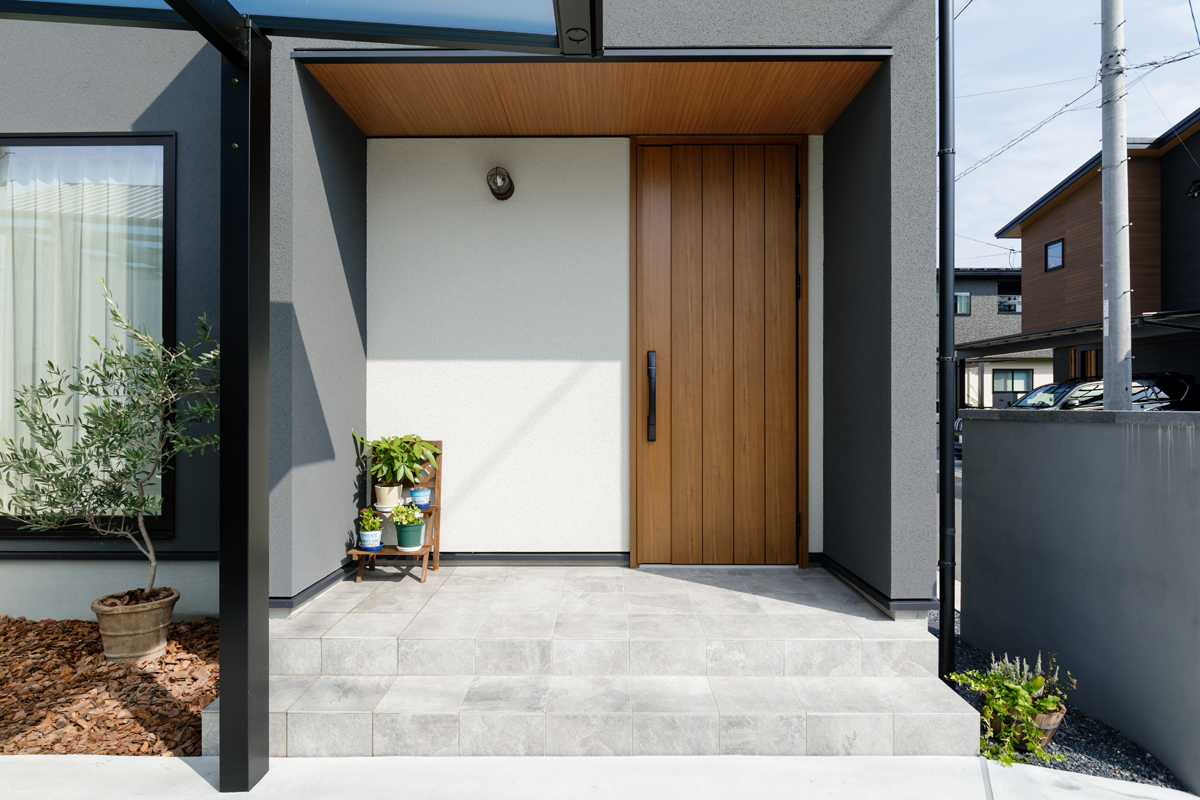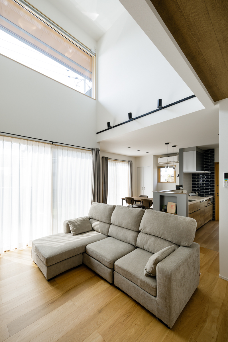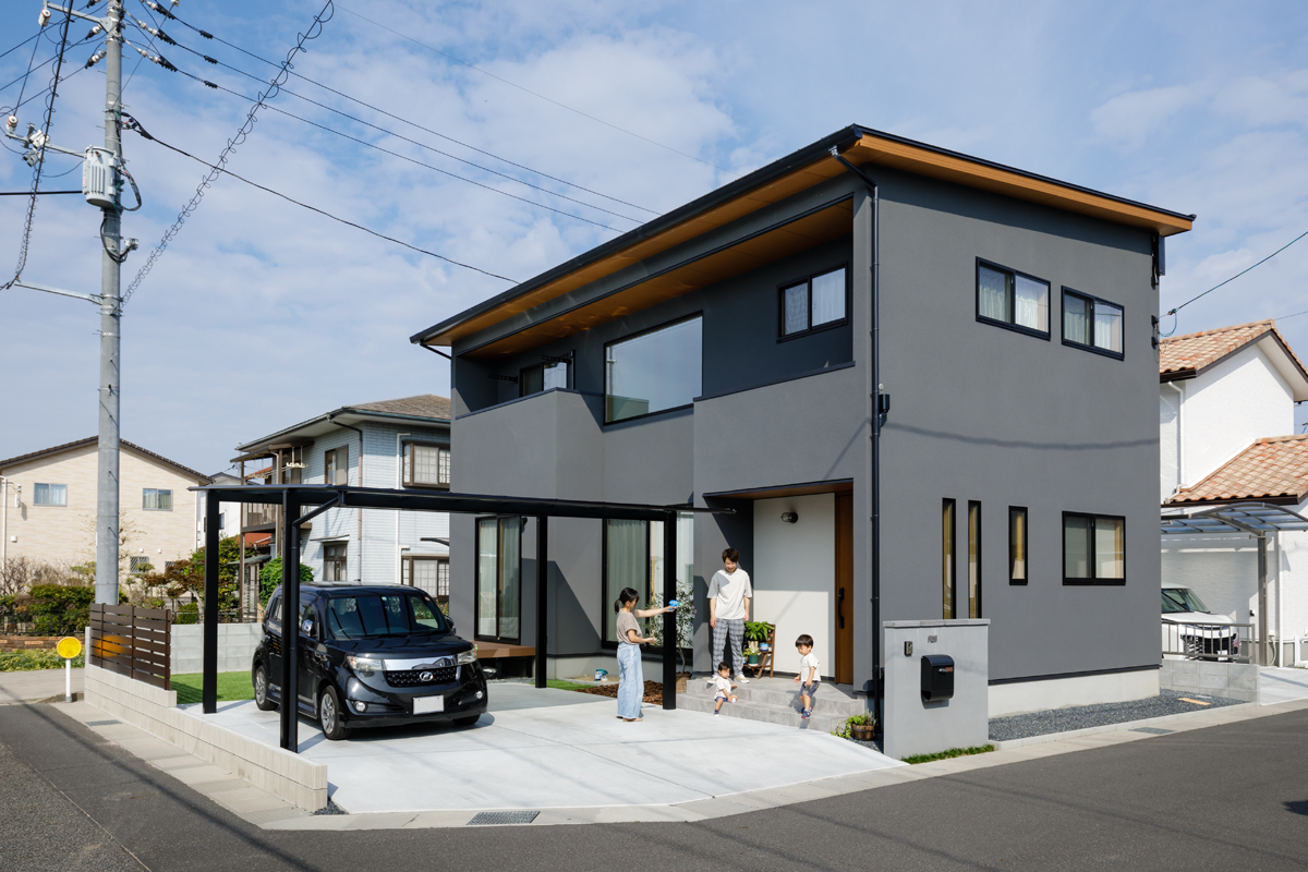 グレーのスタイリッシュな外観と、吹き抜けのあるLDKが特徴的なお家です。