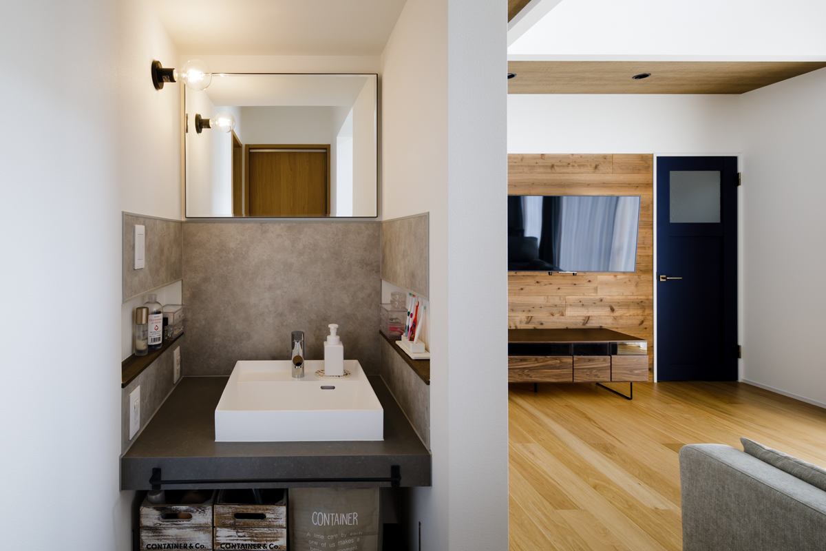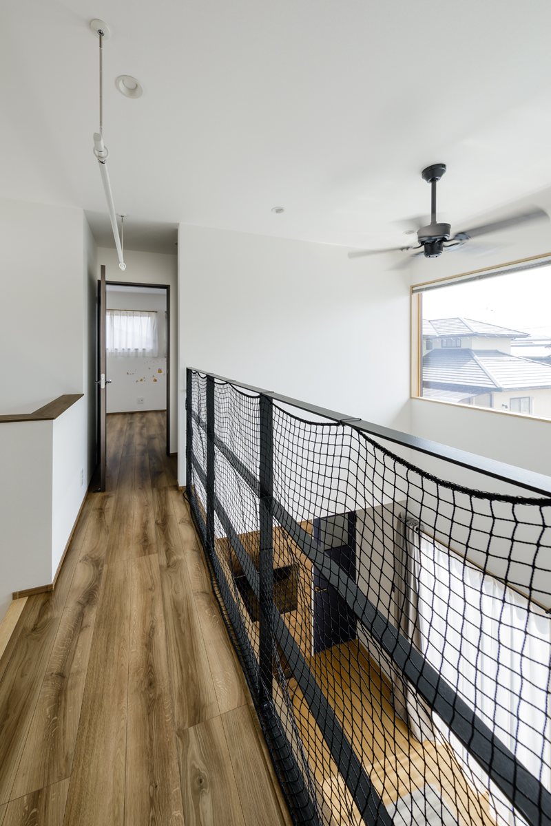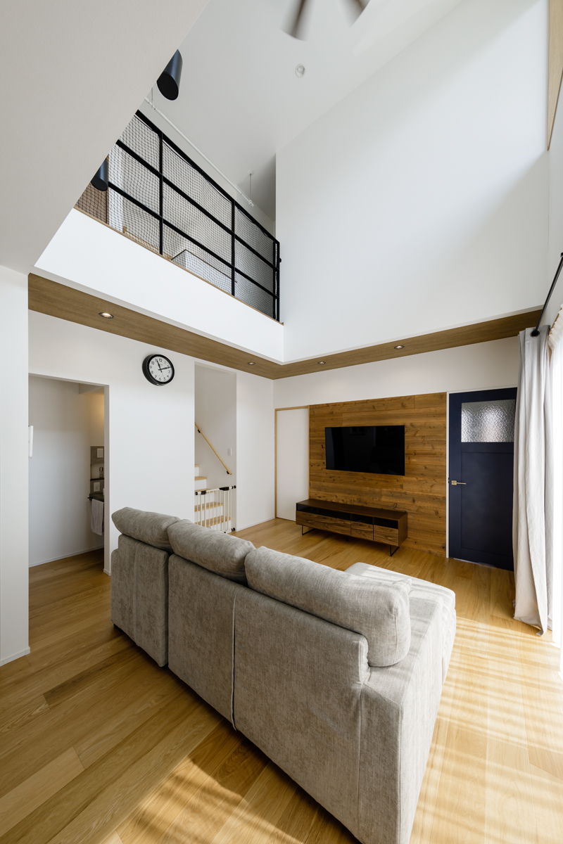 木製のテレビ背面壁やリビングドアなどのディテールにより、アメリカンな印象を与えてくれます。アイアンの手摺がクールな雰囲気を醸し出し、空間デザインにもお施主様のこだわりを感じることができます。2階廊下のアイアン手摺にはネットを設置しており、安全面への配慮も欠かしていません。また、シューズクロークのある2WAY玄関や、スタイリッシュな洗面台、集中して仕事ができる書斎、キッチン壁にはタイルでアクセントを加えるなど、細かな仕様にもこだわっています。