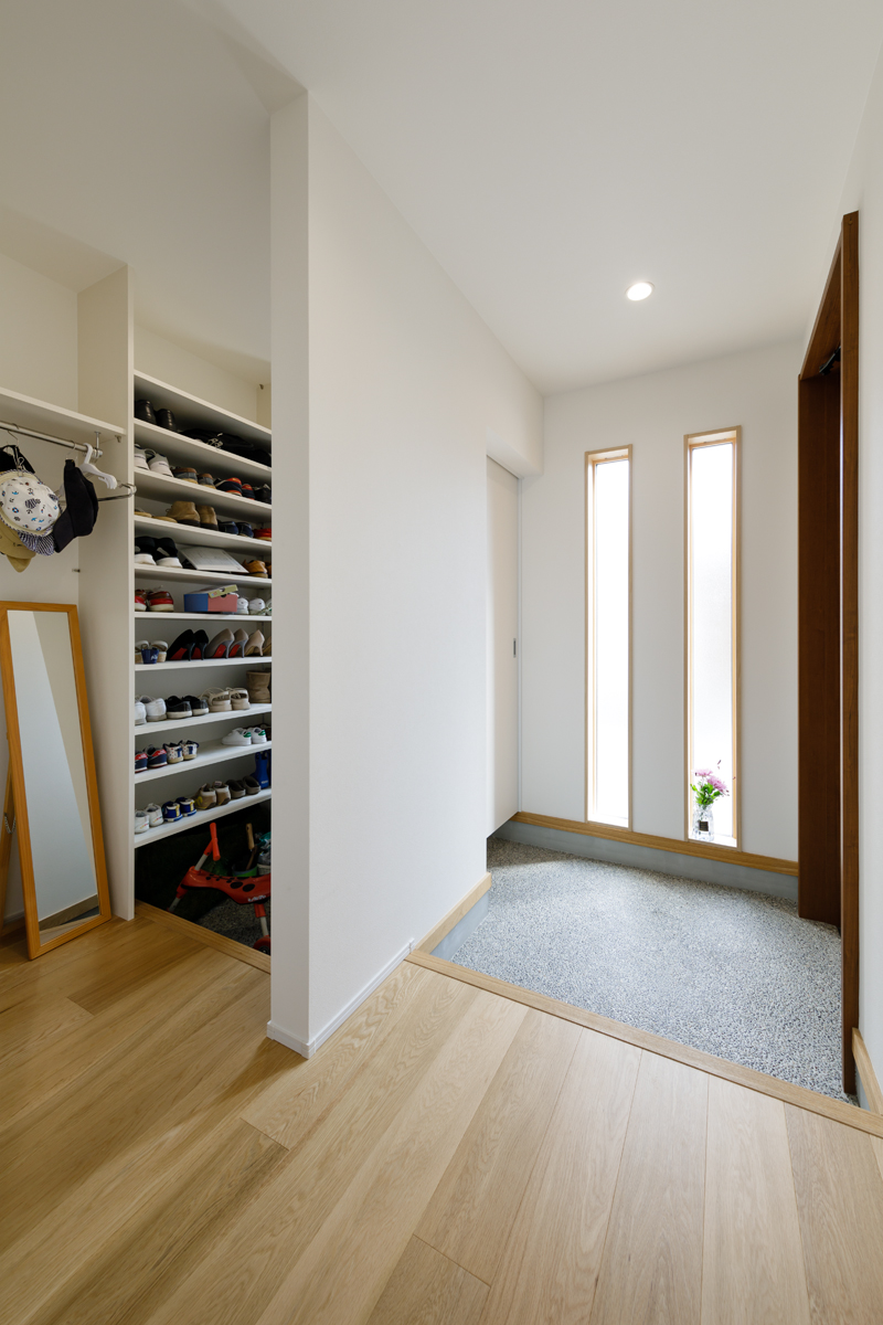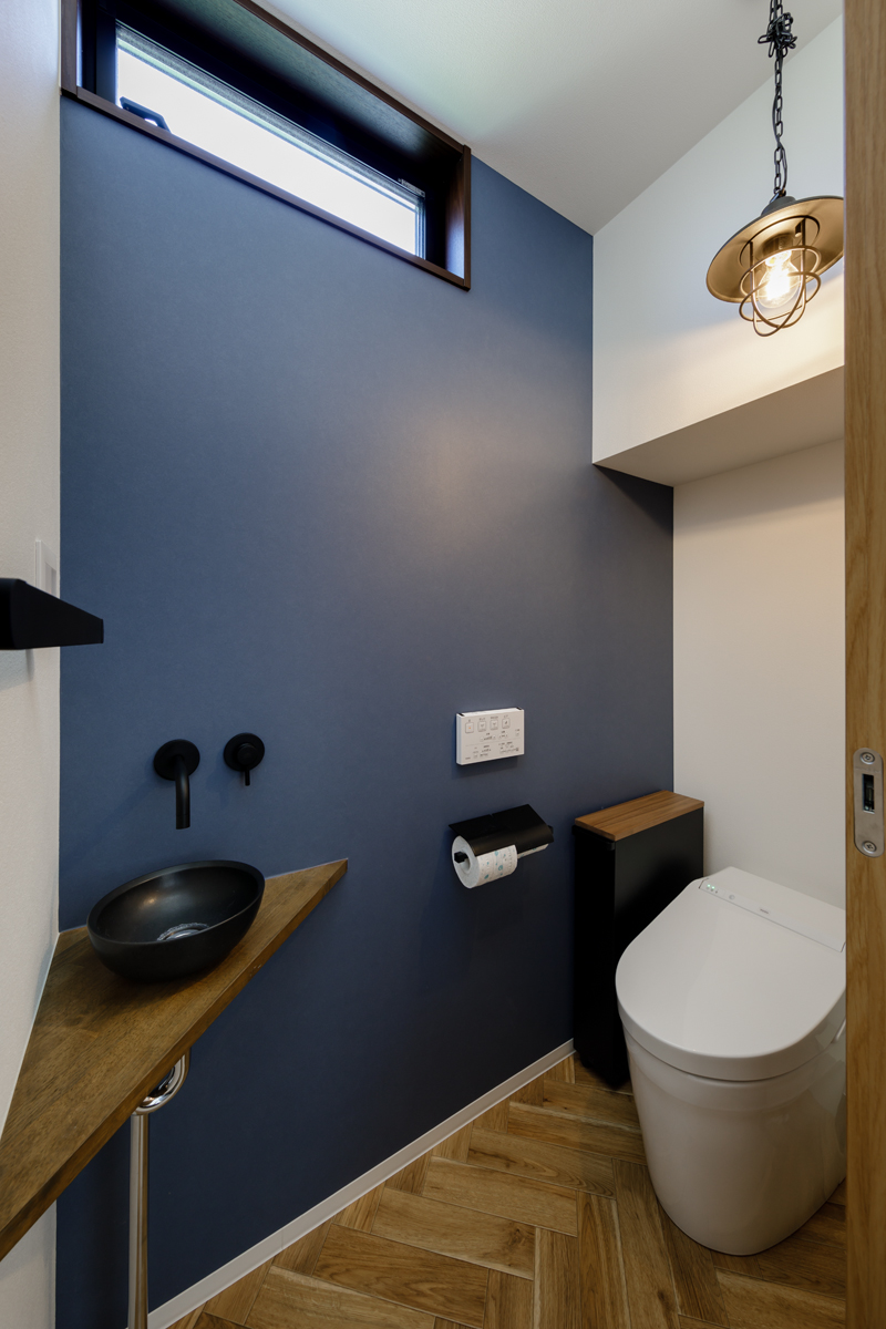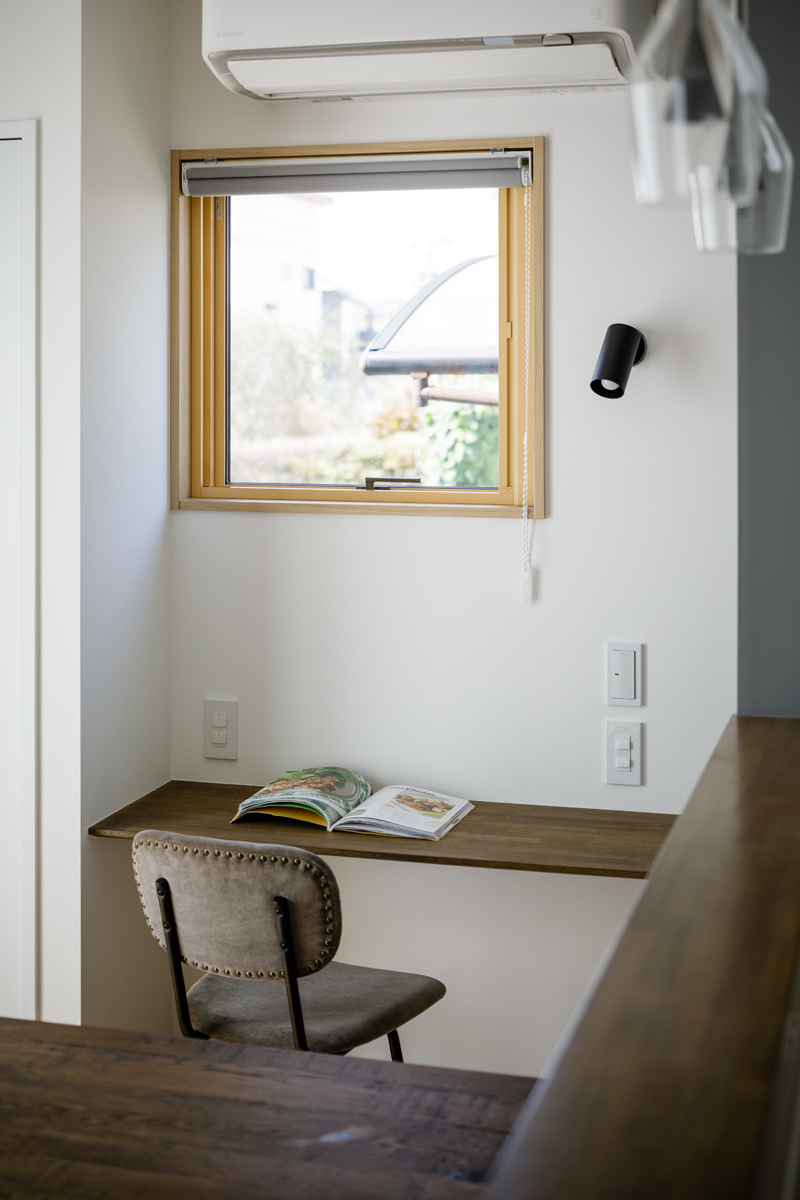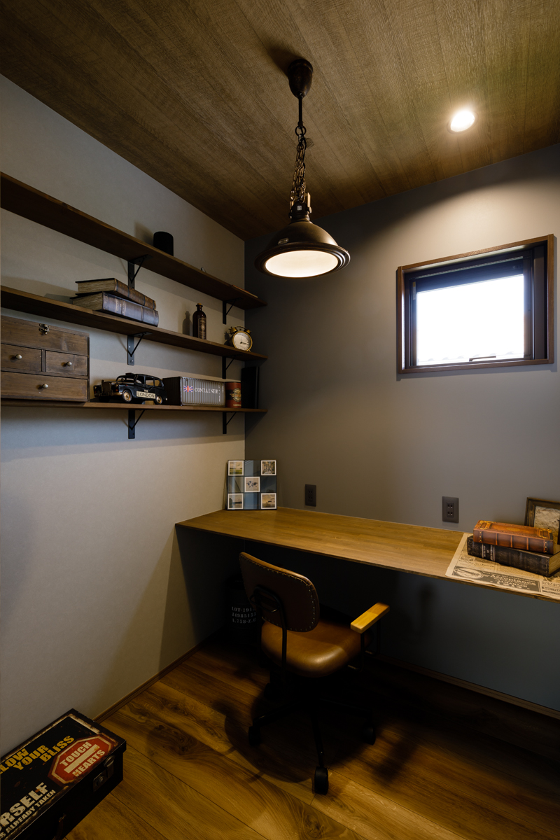 木製のテレビ背面壁やリビングドアなどのディテールにより、アメリカンな印象を与えてくれます。アイアンの手摺がクールな雰囲気を醸し出し、空間デザインにもお施主様のこだわりを感じることができます。2階廊下のアイアン手摺にはネットを設置しており、安全面への配慮も欠かしていません。また、シューズクロークのある2WAY玄関や、スタイリッシュな洗面台、集中して仕事ができる書斎、キッチン壁にはタイルでアクセントを加えるなど、細かな仕様にもこだわっています。