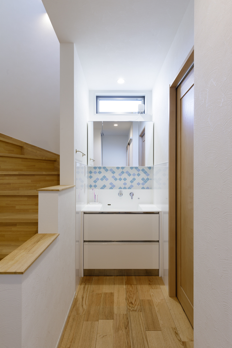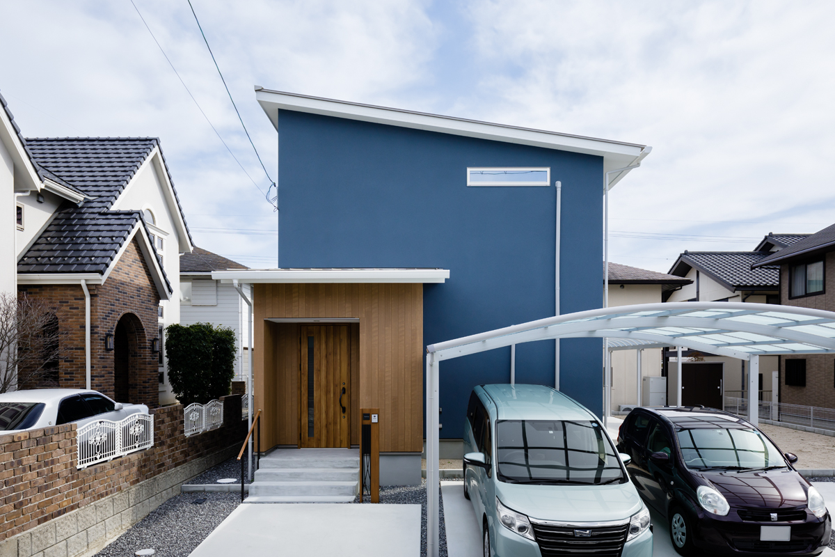 ブルーの塗り壁で全体的に心地よい雰囲気を演出し、エントランスの木目調サイディングが温かみをプラス。